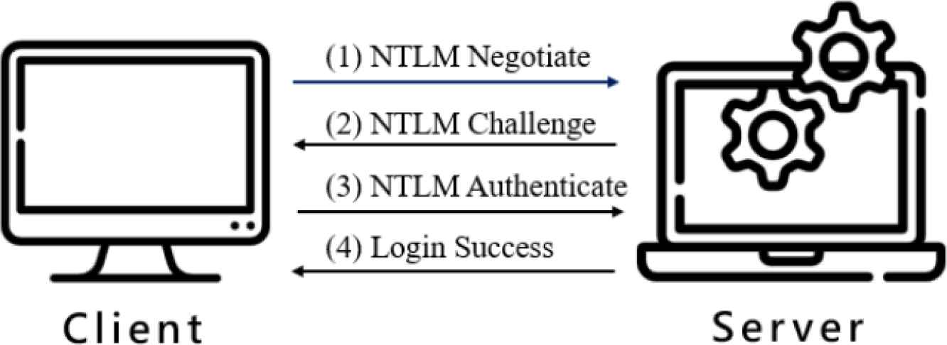 NTLM is a challenge–response authentication protocol as shown in Figure 1. First, the client sends a negotiate message advertising its capabilities to the server. Then the server responds with a challenge message. Third, the client encrypts the challenge message with its username and password as a authenticate message, and then the server will verify whether the password is correct or not.