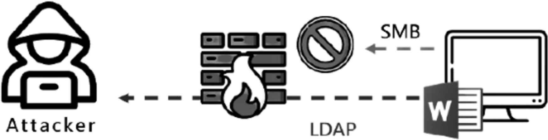In the previous research of Microsoft Offices, NTLM leak could only transport through the SMB protocol. However, Most Network Manager would prohibit outbound or inbound SMB connections. Because notorious exploit or hacker tools such as “EternalBlue” and “PsExec” are transported over SMB protocol. Our research attempts to change the UNC path into other URLs for the purpose of causing the NTLM leak through other protocols. Finally, we found out that manipulating the UNC path into a URL with HTTP/HTTPS or LDAP protocol would also cause the NTLM leak. Nevertheless, URL with HTTP(S) would only cause the leak when the setting on the users’ computer is “automatic logon only on Intranet zone” or “automatic logon with current username and password”. In contrast, URL with LDAP will trigger NTLM leak just as SMB, but to avoid being block by firewall as shown in Figure 3.