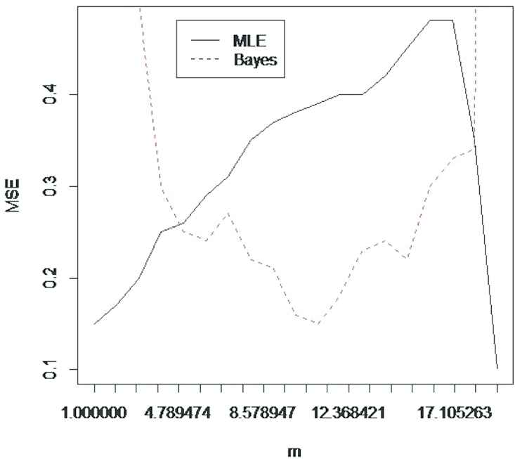 The Bayes estimates of m under SEL function for different values of μ1 and μ2.