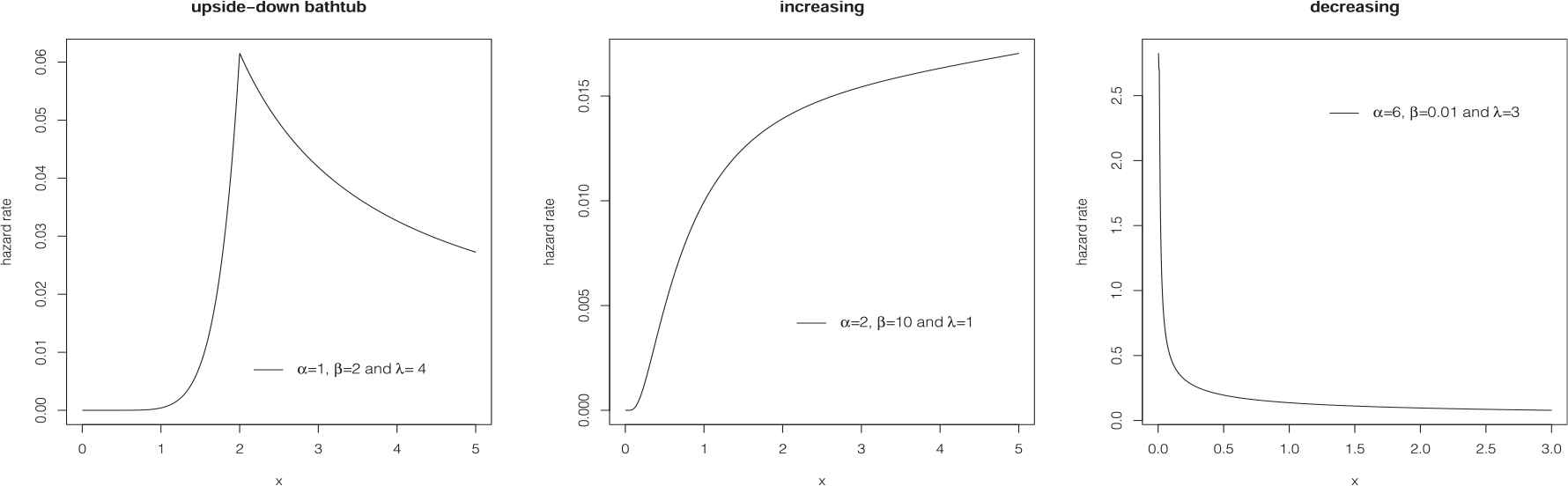 Using the “ghyp” package in the statistical software R and part (4) of Theorem 2.1, the hazard rate function of T can be computed. Figure 2 presents the hazard function curves of (5) for some parameter values. As a result of the fact that the hazard function of the proposed distribution can be decreasing, increasing, upside-down bathtub, it is evident that the proposed three-parameter distribution is quite flexible and can be used effectively in analyzing data with monotone as well as non-monotone hazard shape which are quite common in reliability and biological studies, for instance.