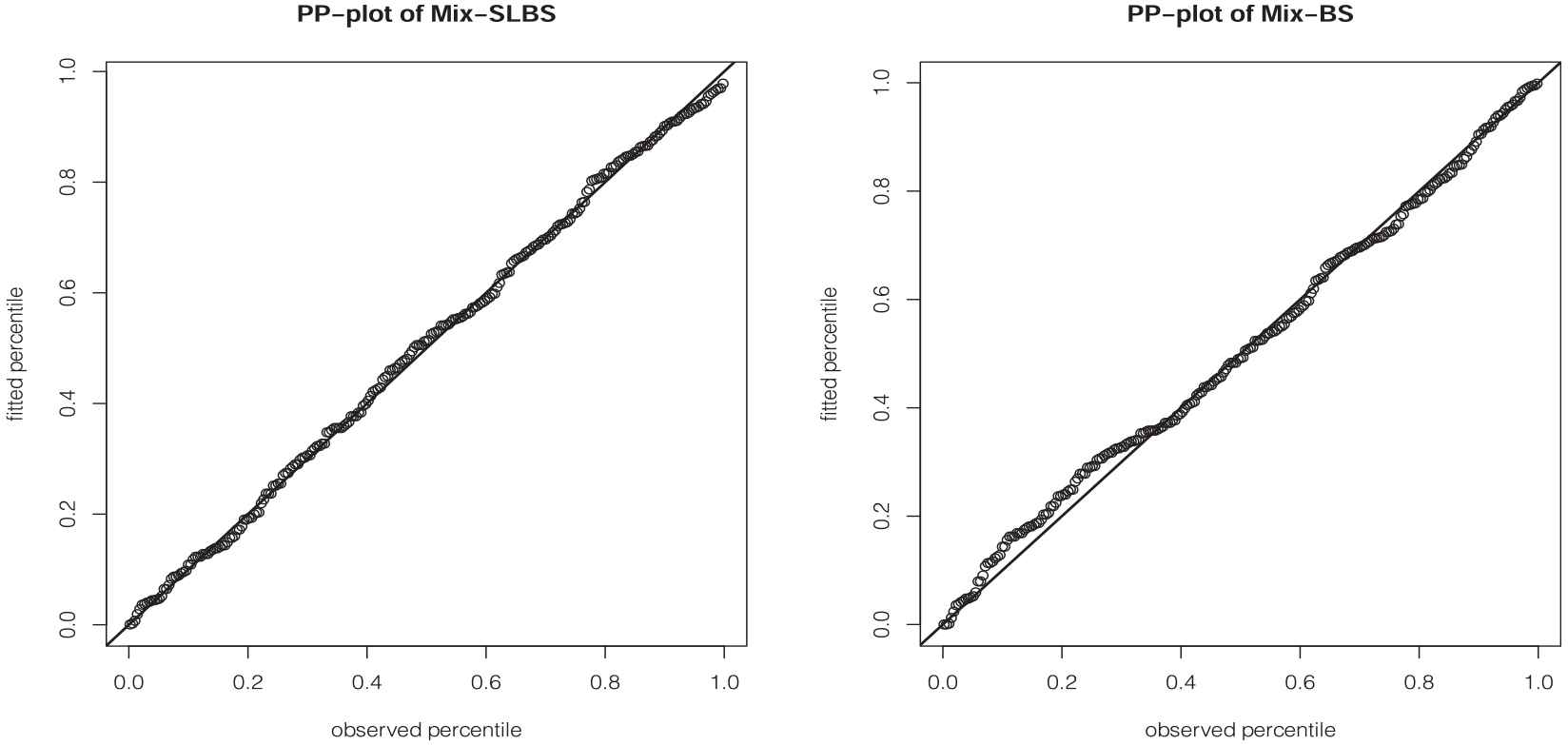 Finally, we provide the probability-probability (PP)-plot of the two best fitted models in Figure 3. The PP-plot shows that the Mix-SLBS model adapts to the shape of the histogram very accurately.