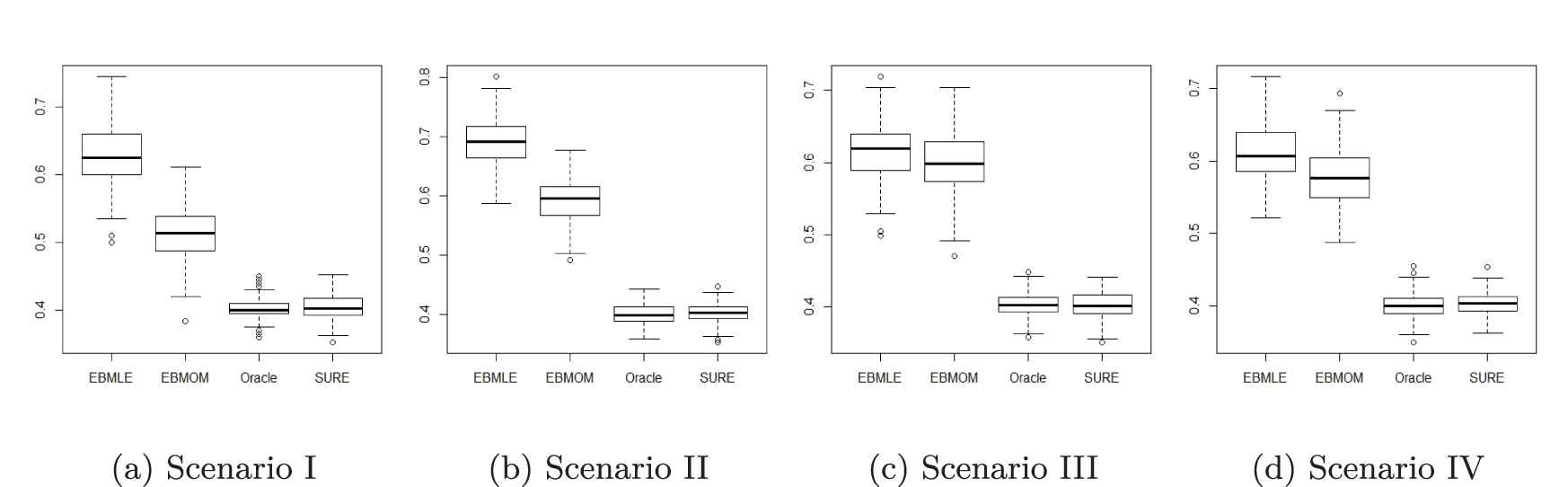 Although empirical approaches such as EBMLE and EBMOM have been frequently used to estimate the model hyper-parameters, we aim to use SURE to estimate the hyper-parameter λ (and other hyper-parameters), because the SURE estimators possess asymptotic optimality properties within the class of heteroscedastic hierarchical normal models [14,15].