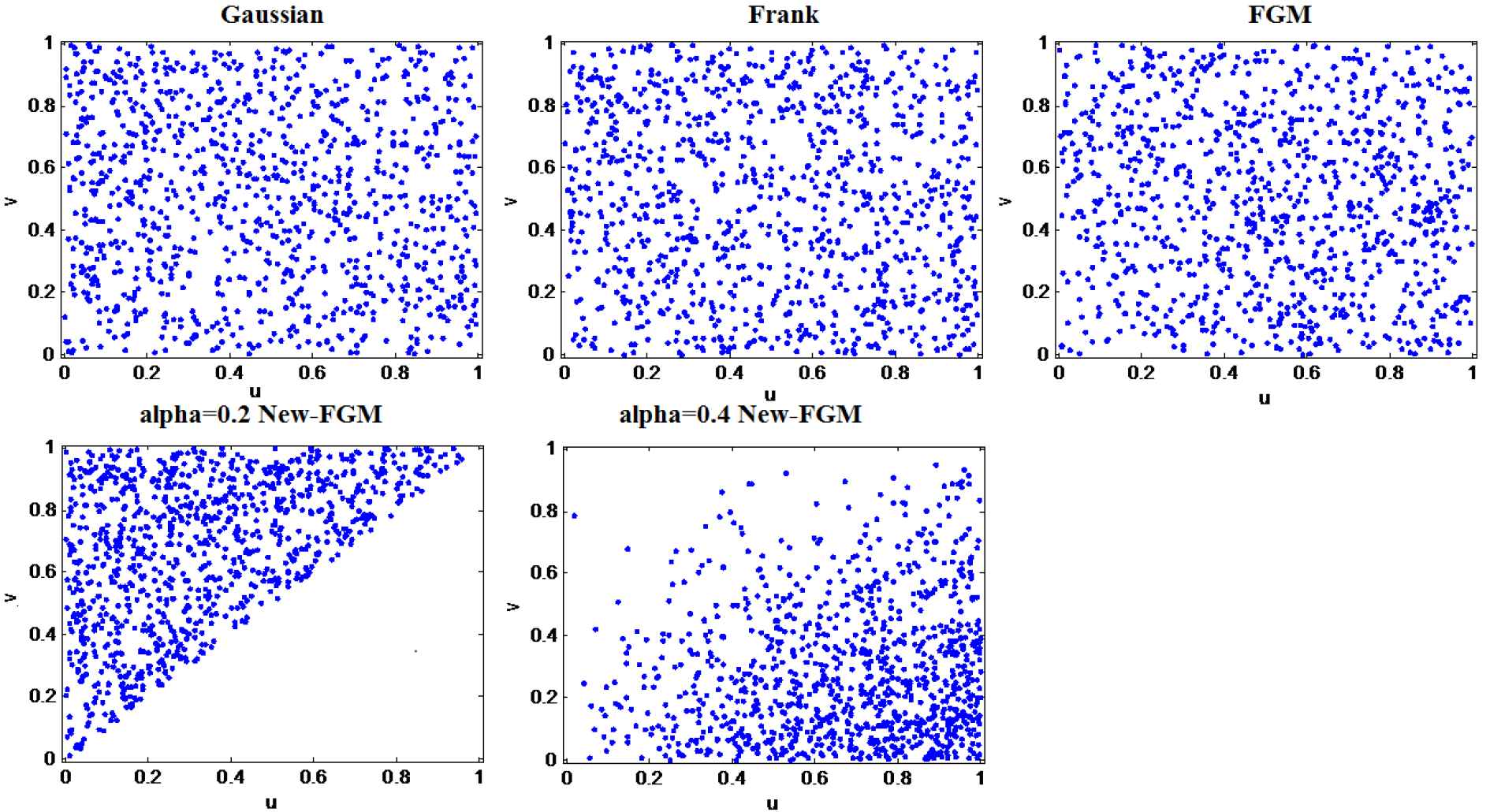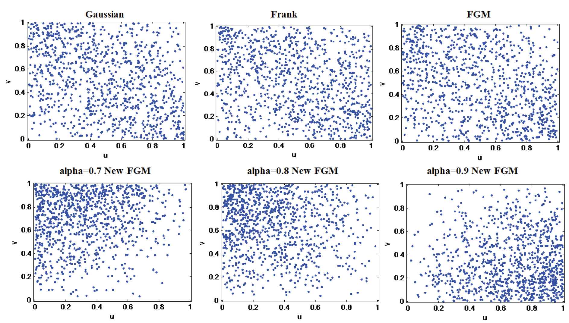 The scatter plots of the (u,v) pairs generated from the copulas for five different Kendall’s τ values is given in Figures 15 for different alpha possibilities, respectively. It should be attended that the Kendall τ value of the FGM copula is between [−2 / 9, 2 / 9] values. Since Kendall’s τ=0.2561 and τ=0.3087 values are outside these boundaries, FGM copula is not shown in Figures 4 and 5.