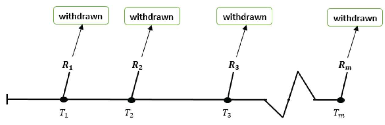 where Rm=n(j=1m1Rj+r) and r is the number of failure items. It is indicate that scheme I is represent Type-I censoring scheme where Rm = n − r.
