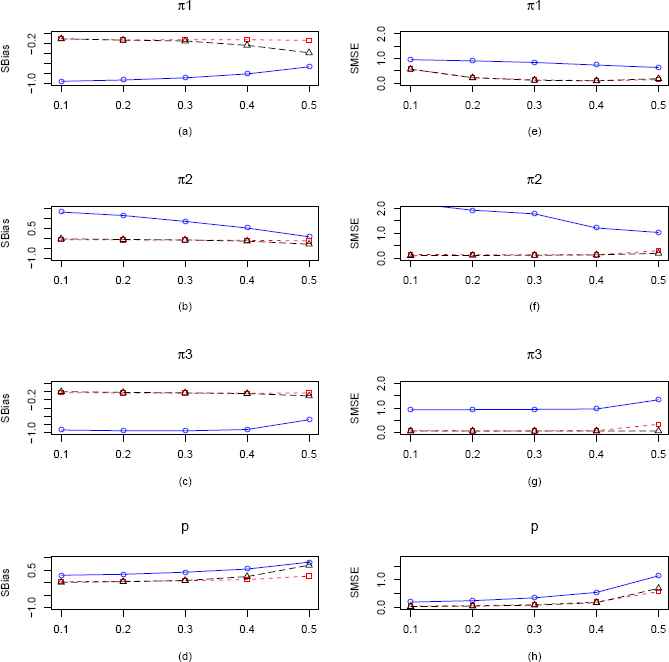 We observe very similar behavior from the plots for n = 100, presented in Figure 12. MLE seems to be performing best and SBias and SMSEs are going down as expected with an increase in sample size except for SMSE of π2 (Figure 12(e)).